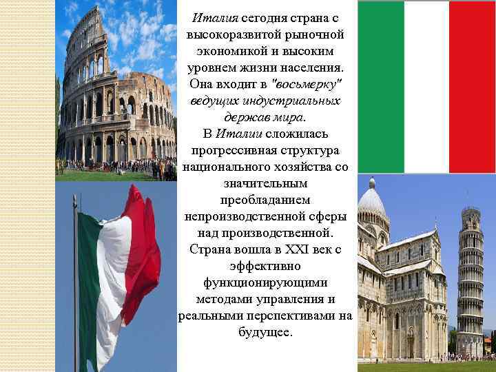 Италия сегодня страна с высокоразвитой рыночной экономикой и высоким уровнем жизни населения. Она входит в "восьмерку" ведущих индустриальных держав мира. В Италии сложилась прогрессивная структура национального хозяйства со значительным преобладанием непроизводственной сферы над производственной. Страна вошла в XXI век с эффективно функционирующими методами управления и реальными перспективами на будущее.