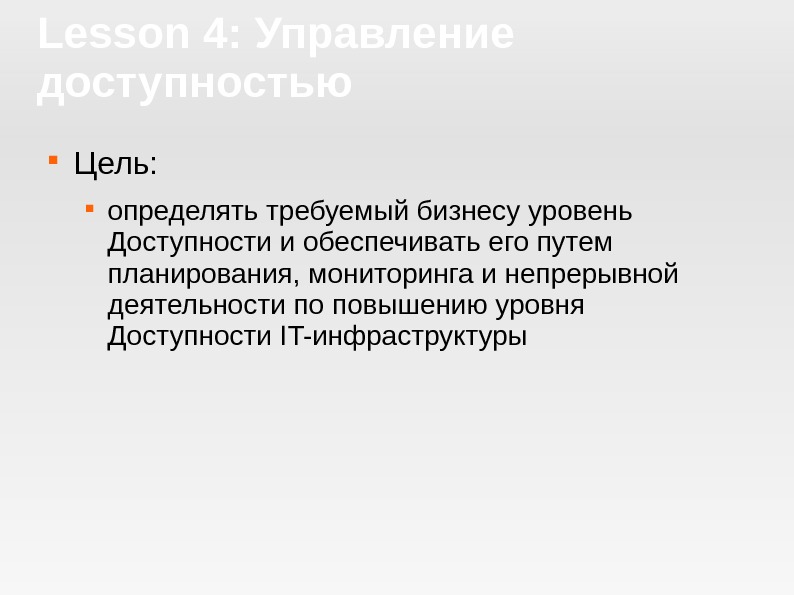 Lesson 4: Управление доступностью Цель: определять требуемый бизнесу уровень Доступности и обеспечивать его путем планирования, мониторинга и непрерывной деятельности по повышению уровня Доступности IT-инфраструктуры