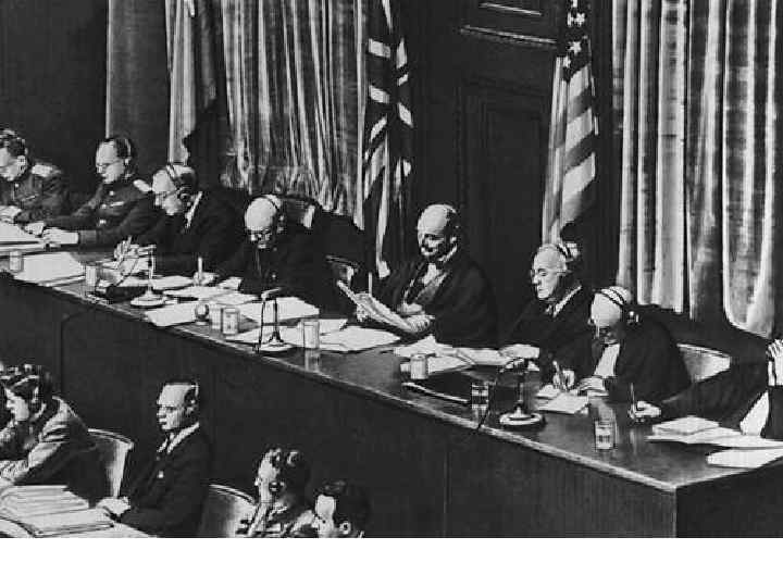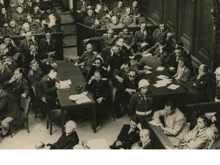 Перед Международным военным трибуналом (создан в соответствии с Декларацией об ответственности гитлеровцев за совершаемые зверства от 30 октября 1943, принятой на Московской конференции 18 -30 октября 1943, и Соглашением между правительствами СССР, США, Великобритании и Франции о судебном преследовании и наказании главных военных преступников европейских стран "оси" от 8 августа 1945 предстали 24 фашистских главаря.