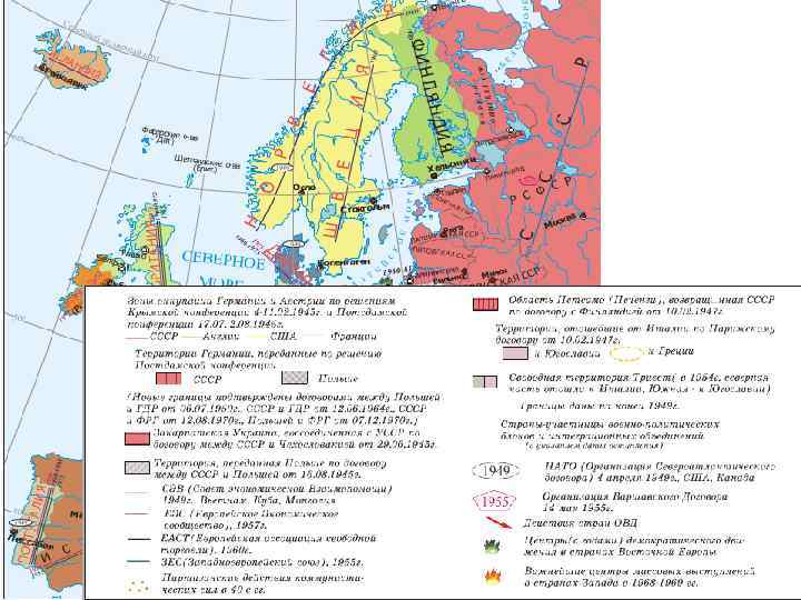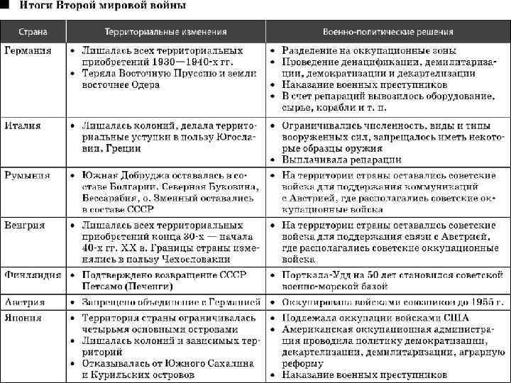Итоги и последствия Второй мировой войны Итоги войны Политические последствия войны Повержен фашизм. Восстановлена независимость и суверенитет стран Европы и Азии Созданы условия для общественно-политических изменений, возможности демократического развития государств На основе антифашистской коалиции создана Организация Объединенных Наций Есть опыт и дальнейшая возможность развивать отношения стран с различным общественно-политическим строем; есть инструмент предотвращения войн Развитие военнотехнической мысли, совершенствование вооружений. Появление ядерного оружия Первые попытки «ядерного диктата» со стороны США. Стремление СССР к паритету с США в области ядерных и иных вооружений. Постепенное превращение СССР и США в сверхдержавы Освобождение стран Центральной и Восточной Европы Советским Союзом Рост влияния левых сил в этих государствах; стремление СССР контролировать развитие региона Рост международного авторитета СССР Активизация деятельности коммунистических партий Франции и Италии