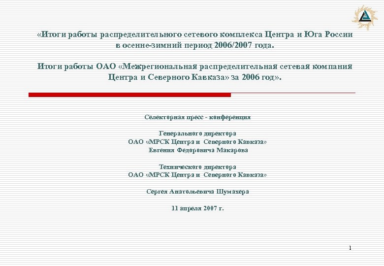 «Итоги работы распределительного сетевого комплекса Центра и Юга России в осенне-зимний период 2006/2007 года. Итоги работы ОАО «Межрегиональная распределительная сетевая компания Центра и Северного Кавказа» за 2006 год» . Селекторная пресс - конференция Генерального директора ОАО «МРСК Центра и Северного Кавказа» Евгения Федоровича Макарова Технического директора ОАО «МРСК Центра и Северного Кавказа» Сергея Анатольевича Шумахера 11 апреля 2007 г. 1