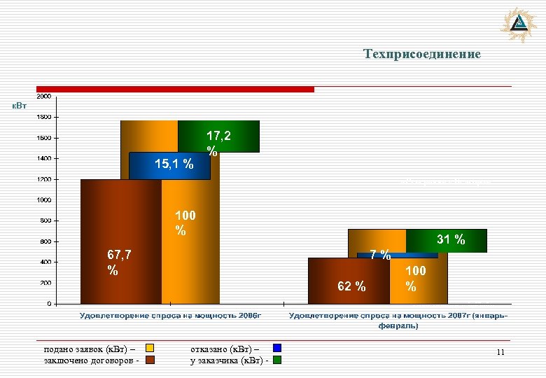 Техприсоединение к. Вт 15, 1 % 17, 2 % «Северная» в Белгороде 100 % 31 % 67, 7 % 7% 62 % 100 % Подстанция «Звезда» подано заявок (к. Вт) – заключено договоров - отказано (к. Вт) – у заказчика (к. Вт) - 11