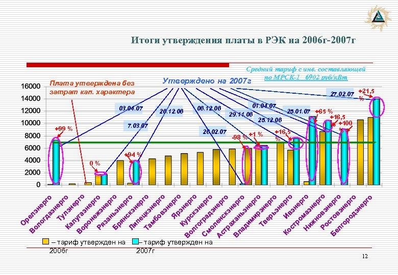 Итоги утверждения платы в РЭК на 2006 г-2007 г Средний тариф с инв. составляющей по МРСК-1 6902 руб/к. Вт Утверждено на 2007 г Плата утверждена без затрат кап. характера 27. 02. 07 +21, 5 % 03. 04. 07 7. 03. 07 +99 % 26. 12. 06 01. 04. 07 25. 01. 07 +65 % 29. 11. 06 +16, 5 25. 12. 06 % +100 % 26. 02. 07 +16, 5 +1 % -98 % % 06. 12. 06 +94 % 0% – тариф утвержден на 2006 г – тариф утвержден на 2007 г 12