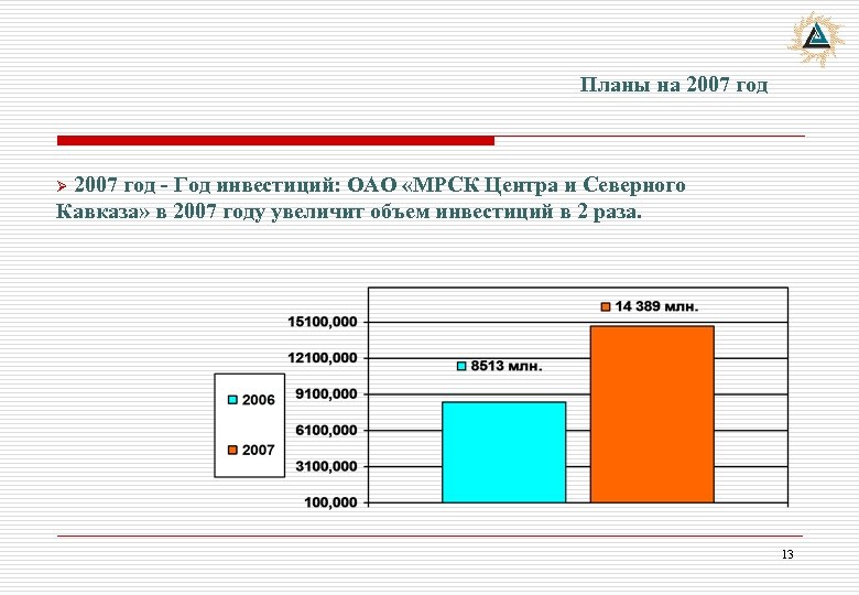 Планы на 2007 год Ø 2007 год - Год инвестиций: ОАО «МРСК Центра и Северного Кавказа» в 2007 году увеличит объем инвестиций в 2 раза. 13