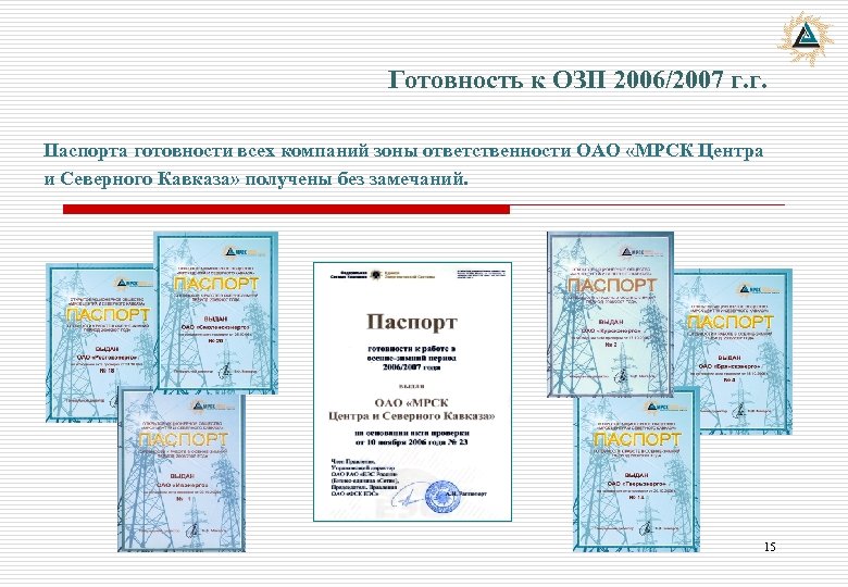 Готовность к ОЗП 2006/2007 г. г. Паспорта готовности всех компаний зоны ответственности ОАО «МРСК Центра и Северного Кавказа» получены без замечаний. 15