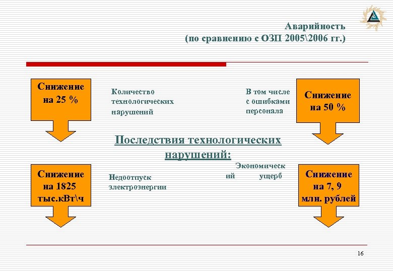 Аварийность (по сравнению с ОЗП 20052006 гг. ) Снижение на 25 % Количество технологических нарушений В том числе с ошибками персонала Снижение на 50 % Последствия технологических нарушений: Снижение на 1825 тыс. к. Втч Недоотпуск электроэнергии Экономическ ий ущерб Снижение на 7, 9 млн. рублей 16