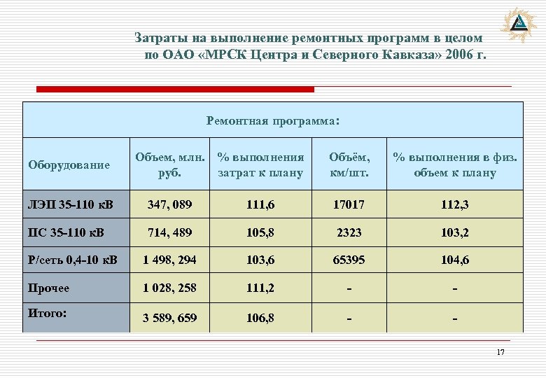 Затраты на выполнение ремонтных программ в целом по ОАО «МРСК Центра и Северного Кавказа» 2006 г. Ремонтная программа: Оборудование Объем, млн. % выполнения руб. затрат к плану Объём, км/шт. % выполнения в физ. объем к плану ЛЭП 35 -110 к. В 347, 089 111, 6 17017 112, 3 ПС 35 -110 к. В 714, 489 105, 8 2323 103, 2 Р/сеть 0, 4 -10 к. В 1 498, 294 103, 6 65395 104, 6 Прочее 1 028, 258 111, 2 - - Итого: 3 589, 659 106, 8 - 17