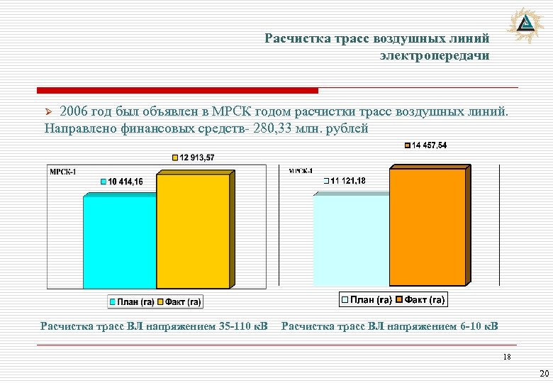Расчистка трасс воздушных линий электропередачи 2006 год был объявлен в МРСК годом расчистки трасс воздушных линий. Направлено финансовых средств- 280, 33 млн. рублей Ø Расчистка трасс ВЛ напряжением 35 -110 к. В Расчистка трасс ВЛ напряжением 6 -10 к. В 18 20
