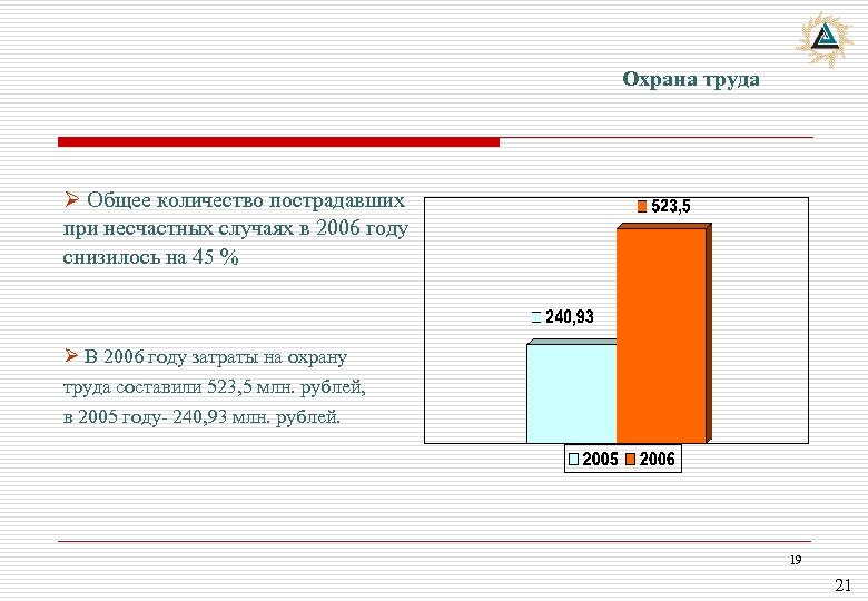 Охрана труда Ø Общее количество пострадавших при несчастных случаях в 2006 году снизилось на 45 % Ø В 2006 году затраты на охрану труда составили 523, 5 млн. рублей, в 2005 году- 240, 93 млн. рублей. 19 21