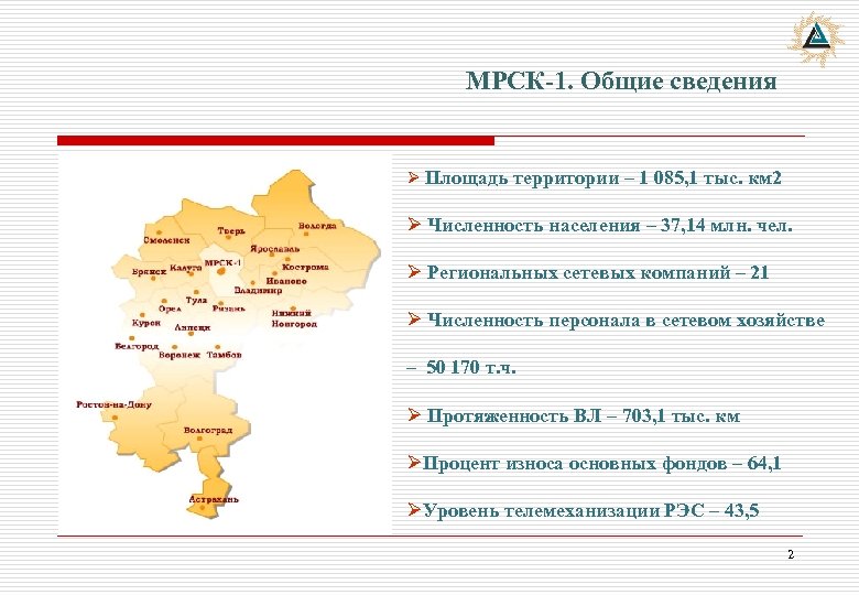 МРСК-1. Общие сведения Ø Площадь территории – 1 085, 1 тыс. км 2 Ø Численность населения – 37, 14 млн. чел. Ø Региональных сетевых компаний – 21 Ø Численность персонала в сетевом хозяйстве – 50 170 т. ч. Ø Протяженность ВЛ – 703, 1 тыс. км ØПроцент износа основных фондов – 64, 1 ØУровень телемеханизации РЭС – 43, 5 2