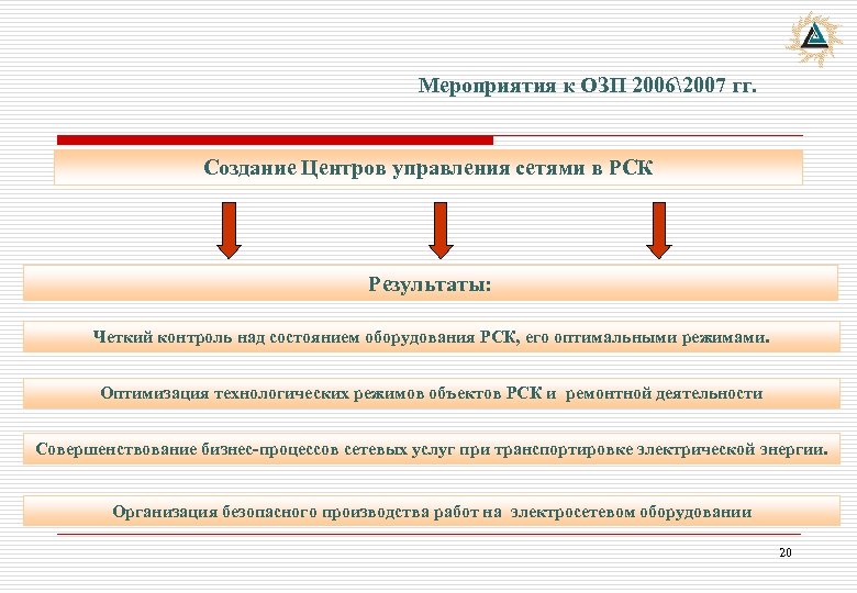 Мероприятия к ОЗП 20062007 гг. Создание Центров управления сетями в РСК Результаты: Четкий контроль над состоянием оборудования РСК, его оптимальными режимами. Оптимизация технологических режимов объектов РСК и ремонтной деятельности Совершенствование бизнес-процессов сетевых услуг при транспортировке электрической энергии. Организация безопасного производства работ на электросетевом оборудовании 20