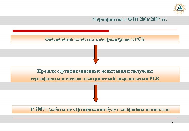 Мероприятия к ОЗП 20062007 гг. Обеспечение качества электроэнергии в РСК Прошли сертификационные испытания и получены сертификаты качества электрической энергии всеми РСК В 2007 г работы по сертификации будут завершены полностью 21