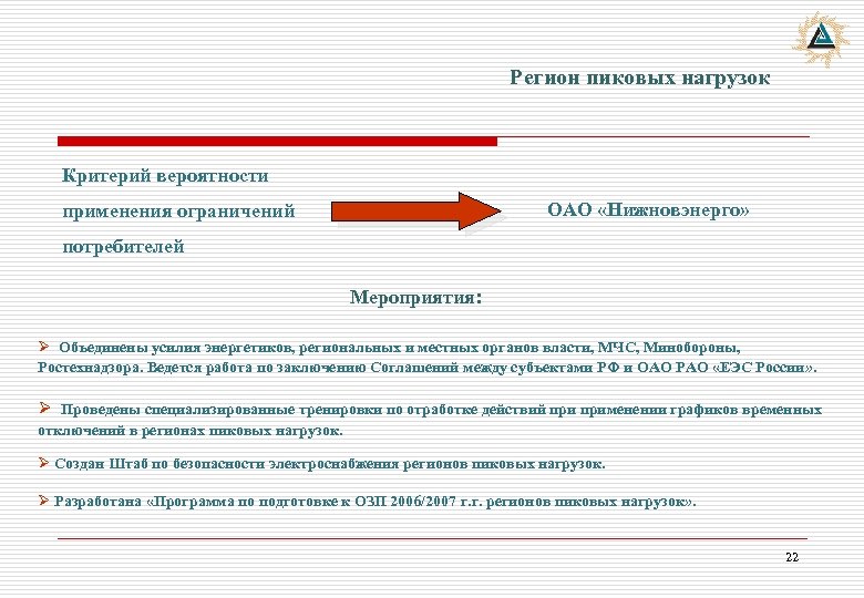 Регион пиковых нагрузок Критерий вероятности ОАО «Нижновэнерго» применения ограничений потребителей Мероприятия: Ø Объединены усилия энергетиков, региональных и местных органов власти, МЧС, Минобороны, Ростехнадзора. Ведется работа по заключению Соглашений между субъектами РФ и ОАО РАО «ЕЭС России» . Ø Проведены специализированные тренировки по отработке действий применении графиков временных отключений в регионах пиковых нагрузок. Ø Создан Штаб по безопасности электроснабжения регионов пиковых нагрузок. Ø Разработана «Программа по подготовке к ОЗП 2006/2007 г. г. регионов пиковых нагрузок» . 22