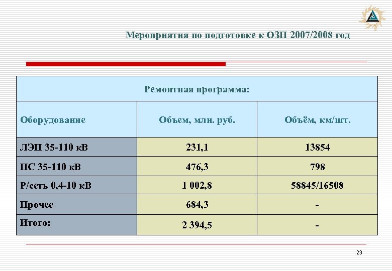 Мероприятия по подготовке к ОЗП 2007/2008 год Ремонтная программа: Оборудование Объем, млн. руб. Объём, км/шт. ЛЭП 35 -110 к. В 231, 1 13854 ПС 35 -110 к. В 476, 3 798 1 002, 8 58845/16508 Прочее 684, 3 - Итого: 2 394, 5 - Р/сеть 0, 4 -10 к. В 23