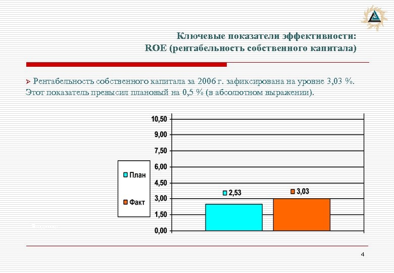 Ключевые показатели эффективности: ROE (рентабельность собственного капитала) ROE Ø Рентабельность собственного капитала за 2006 г. зафиксирована на уровне 3, 03 %. Этот показатель превысил плановый на 0, 5 % (в абсолютном выражении). Владимир 4