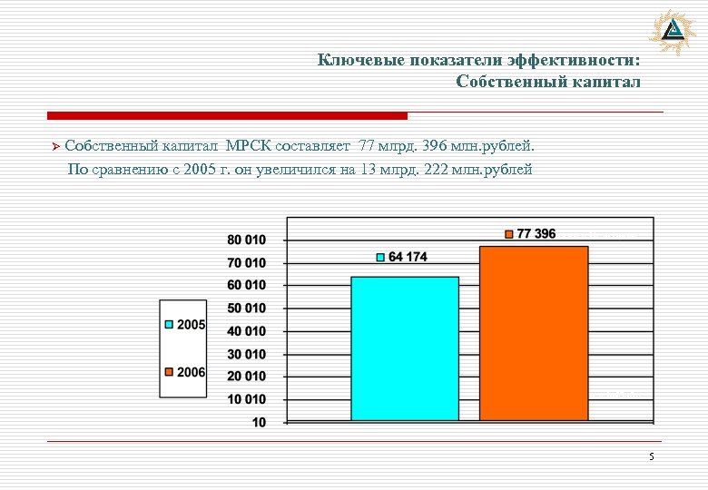 Ключевые показатели эффективности: Собственный капитал Ø Собственный капитал МРСК составляет 77 млрд. 396 млн. рублей. По сравнению с 2005 г. он увеличился на 13 млрд. 222 млн. рублей «Северная» в Белгороде Подстанция «Звезда» 5