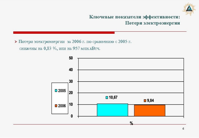 Ключевые показатели эффективности: Потери электроэнергии Ø Потери электроэнергии за 2006 г. по сравнению с 2005 г. снижены на 0, 83 %, или на 957 млн. к. Втч. 6