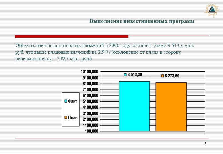 Выполнение инвестиционных программ Объем освоения капитальных вложений в 2006 году составил сумму 8 513, 3 млн. руб. что выше плановых значений на 2, 9 % (отклонение от плана в сторону перевыполнения – 239, 7 млн. руб. ) 7