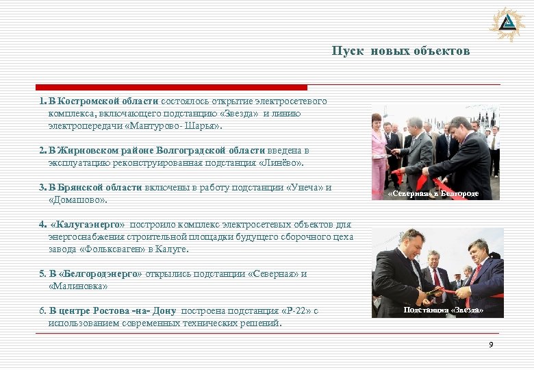 Пуск новых объектов 1. В Костромской области состоялось открытие электросетевого комплекса, включающего подстанцию «Звезда» и линию электропередачи «Мантурово- Шарья» . 2. В Жирновском районе Волгоградской области введена в эксплуатацию реконструированная подстанция «Линёво» . 3. В Брянской области включены в работу подстанции «Унеча» и «Домашово» . «Северная» в Белгороде 4. «Калугаэнерго» построило комплекс электросетевых объектов для энергоснабжения строительной площадки будущего сборочного цеха завода «Фольксваген» в Калуге. 5. В «Белгородэнерго» открылись подстанции «Северная» и «Малиновка» 6. В центре Ростова -на- Дону построена подстанция «Р-22» с использованием современных технических решений. Подстанция «Звезда» 9