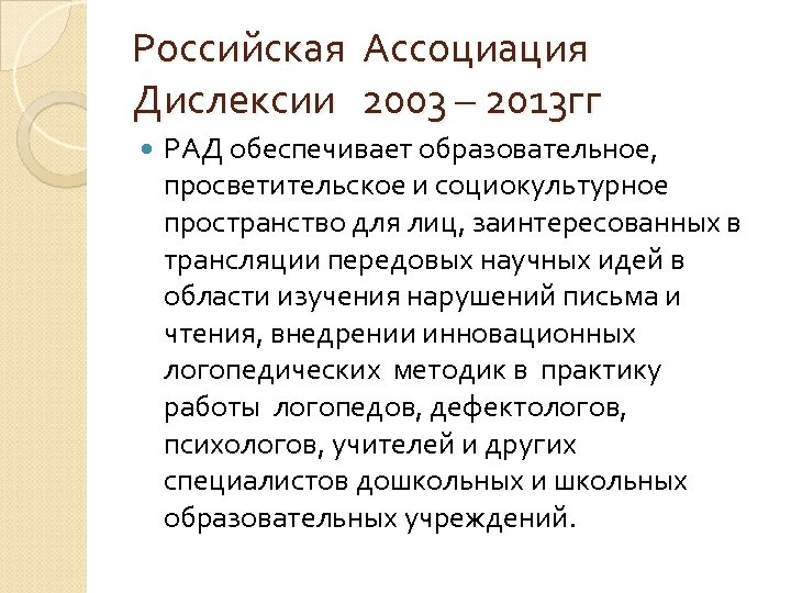 Российская Ассоциация Дислексии 2003 – 2013 гг РАД обеспечивает образовательное, просветительское и социокультурное пространство для лиц, заинтересованных в трансляции передовых научных идей в области изучения нарушений письма и чтения, внедрении инновационных логопедических методик в практику работы логопедов, дефектологов, психологов, учителей и других специалистов дошкольных и школьных образовательных учреждений.
