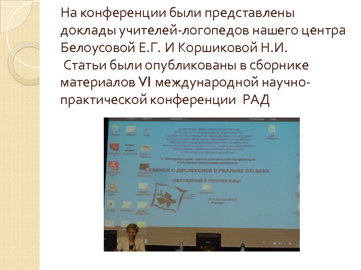 На конференции были представлены доклады учителей-логопедов нашего центра Белоусовой Е. Г. И Коршиковой Н. И. Статьи были опубликованы в сборнике материалов VI международной научнопрактической конференции РАД