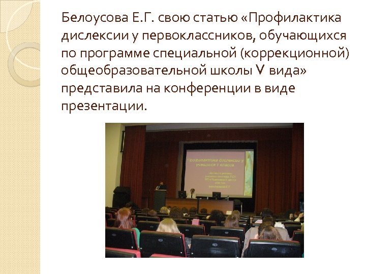 Белоусова Е. Г. свою статью «Профилактика дислексии у первоклассников, обучающихся по программе специальной (коррекционной) общеобразовательной школы V вида» представила на конференции в виде презентации.