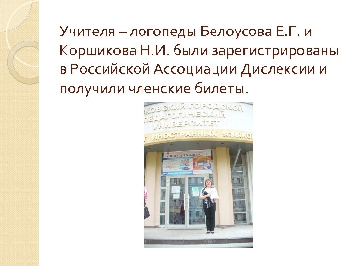 Учителя – логопеды Белоусова Е. Г. и Коршикова Н. И. были зарегистрированы в Российской Ассоциации Дислексии и получили членские билеты.