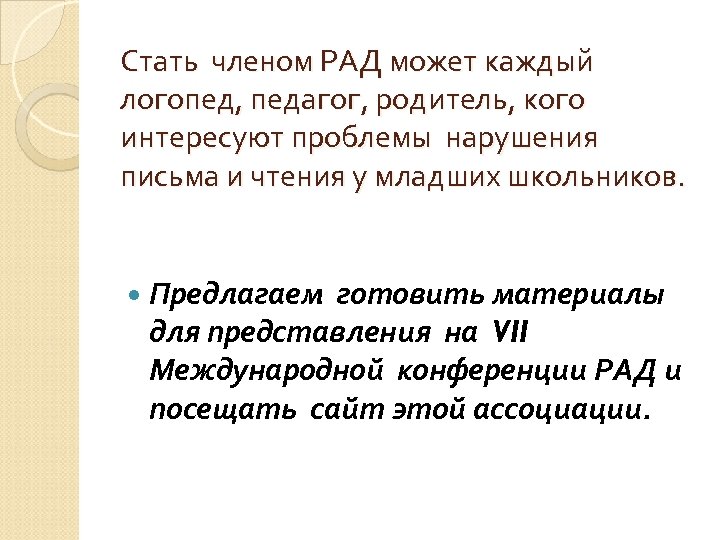 Стать членом РАД может каждый логопед, педагог, родитель, кого интересуют проблемы нарушения письма и чтения у младших школьников. Предлагаем готовить материалы для представления на VII Международной конференции РАД и посещать сайт этой ассоциации.