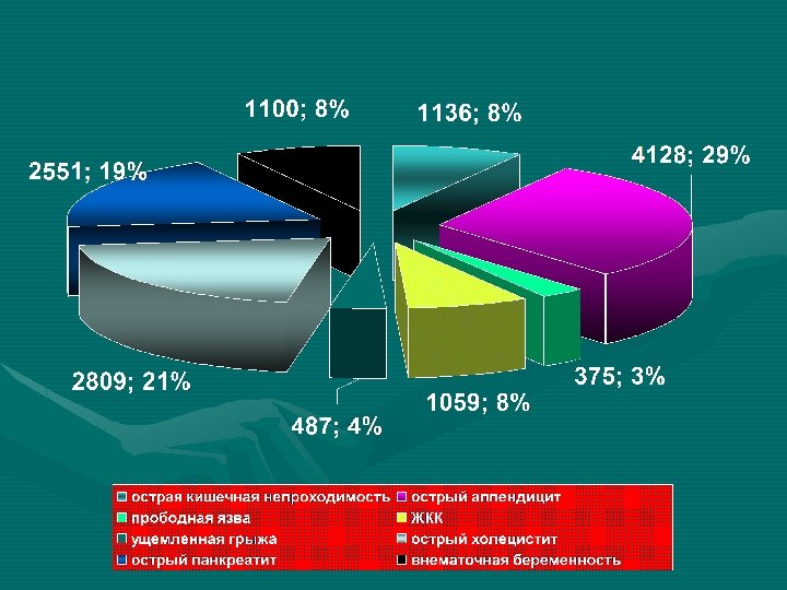 Летальность от острой хирургической патологии • • • Острая кишечная непроходимость – 2, 6 (5, 1) Острый аппендицит 0, 1 Прободная язва 4, 8 8, 2 Желудочно- кишечное кровотечение 3, 4 5, 3 Ущемленная грыжа 4, 3 3, 2 Острый холецистит 0, 7 0, 9 Острый панкреатит 2, 4 2, 5 Внематочная беременность 0 Всего 1, 4