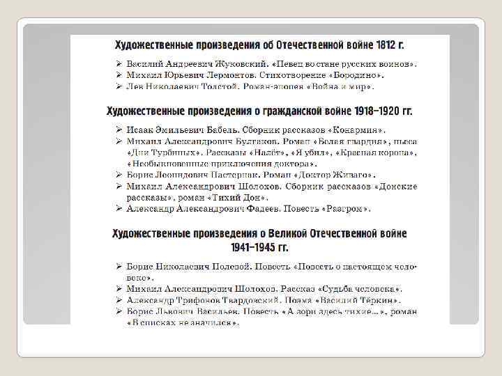 Дмитрий Иванович Фонвизин. Комедия «Недоросль» Александр Сергеевич Грибоедов. Комедия «Горе от ума» Николай Васильевич Гоголь. Повесть «Тарас Бульба» Алексей Николаевич Островский. Драма «Гроза» Иван Сергеевич Тургенев. Роман «Отцы и дети» Лев Николаевич Толстой. Роман-эпопея «Война и мир» Константин Георгиевич Паустовский. Рассказ «Телеграмма» Валентин Григорьевич Распутин. Повести «Последний срок» , «Прощание с Матёрой» Художественные произведения