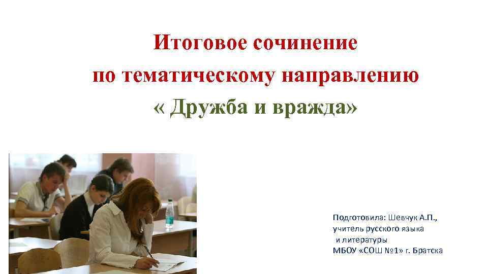 Итоговое сочинение по тематическому направлению « Дружба и вражда» Подготовила: Шевчук А. П. , учитель русского языка и литературы МБОУ «СОШ № 1» г. Братска