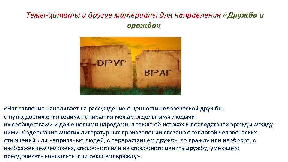 Темы-цитаты и другие материалы для направления «Дружба и вражда» «Направление нацеливает на рассуждение о ценности человеческой дружбы, о путях достижения взаимопонимания между отдельными людьми, их сообществами и даже целыми народами, а также об истоках и последствиях вражды между ними. Содержание многих литературных произведений связано с теплотой человеческих отношений или неприязнью людей, с перерастанием дружбы во вражду или наоборот, с изображением человека, способного или не способного ценить дружбу, умеющего преодолевать конфликты или сеющего вражду» .