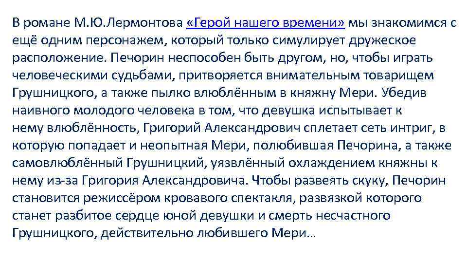 В романе М. Ю. Лермонтова «Герой нашего времени» мы знакомимся с ещё одним персонажем, который только симулирует дружеское расположение. Печорин неспособен быть другом, но, чтобы играть человеческими судьбами, притворяется внимательным товарищем Грушницкого, а также пылко влюблённым в княжну Мери. Убедив наивного молодого человека в том, что девушка испытывает к нему влюблённость, Григорий Александрович сплетает сеть интриг, в которую попадает и неопытная Мери, полюбившая Печорина, а также самовлюблённый Грушницкий, уязвлённый охлаждением княжны к нему из-за Григория Александровича. Чтобы развеять скуку, Печорин становится режиссёром кровавого спектакля, развязкой которого станет разбитое сердце юной девушки и смерть несчастного Грушницкого, действительно любившего Мери…