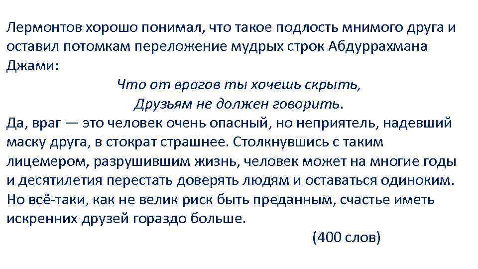Лермонтов хорошо понимал, что такое подлость мнимого друга и оставил потомкам переложение мудрых строк Абдуррахмана Джами: Что от врагов ты хочешь скрыть, Друзьям не должен говорить. Да, враг — это человек очень опасный, но неприятель, надевший маску друга, в стократ страшнее. Столкнувшись с таким лицемером, разрушившим жизнь, человек может на многие годы и десятилетия перестать доверять людям и оставаться одиноким. Но всё-таки, как не велик риск быть преданным, счастье иметь искренних друзей гораздо больше. (400 слов)