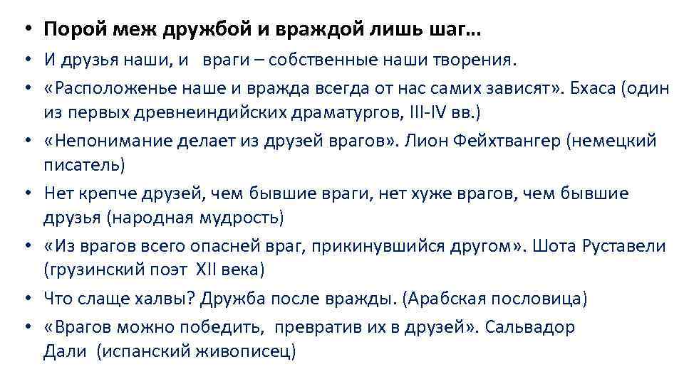 • Порой меж дружбой и враждой лишь шаг… • И друзья наши, и враги – собственные наши творения. • «Расположенье наше и вражда всегда от нас самих зависят» . Бхаса (один из первых древнеиндийских драматургов, III-IV вв. ) • «Непонимание делает из друзей врагов» . Лион Фейхтвангер (немецкий писатель) • Нет крепче друзей, чем бывшие враги, нет хуже врагов, чем бывшие друзья (народная мудрость) • «Из врагов всего опасней враг, прикинувшийся другом» . Шота Руставели (грузинский поэт XII века) • Что слаще халвы? Дружба после вражды. (Арабская пословица) • «Врагов можно победить, превратив их в друзей» . Сальвадор Дали (испанский живописец)