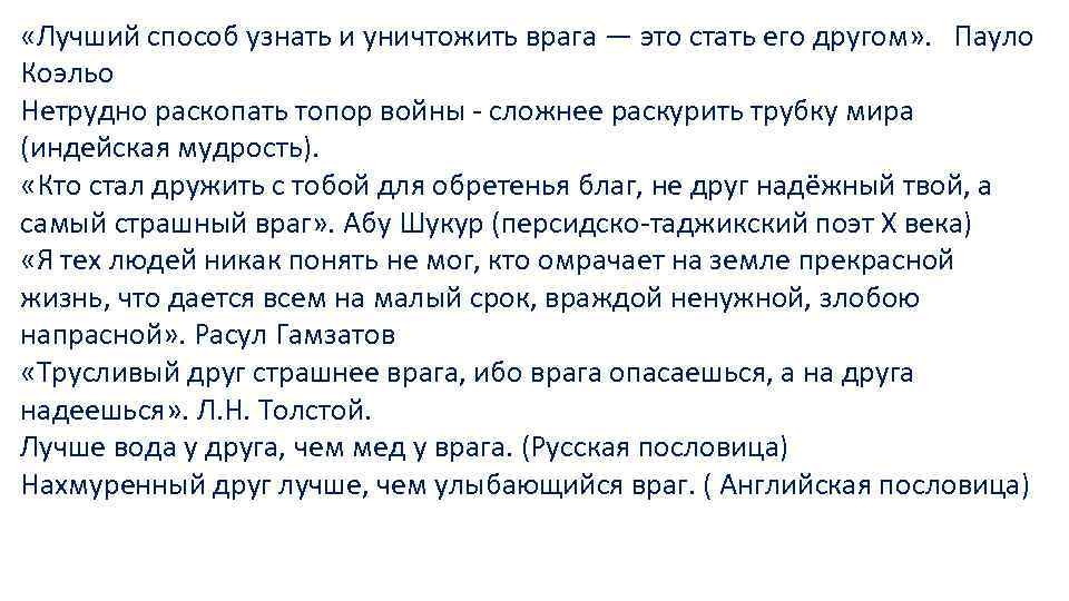 «Лучший способ узнать и уничтожить врага — это стать его другом» . Пауло Коэльо Нетрудно раскопать топор войны - сложнее раскурить трубку мира (индейская мудрость). «Кто стал дружить с тобой для обретенья благ, не друг надёжный твой, а самый страшный враг» . Абу Шукур (персидско-таджикский поэт X века) «Я тех людей никак понять не мог, кто омрачает на земле прекрасной жизнь, что дается всем на малый срок, враждой ненужной, злобою напрасной» . Расул Гамзатов «Трусливый друг страшнее врага, ибо врага опасаешься, а на друга надеешься» . Л. Н. Толстой. Лучше вода у друга, чем мед у врага. (Русская пословица) Нахмуренный друг лучше, чем улыбающийся враг. ( Английская пословица)