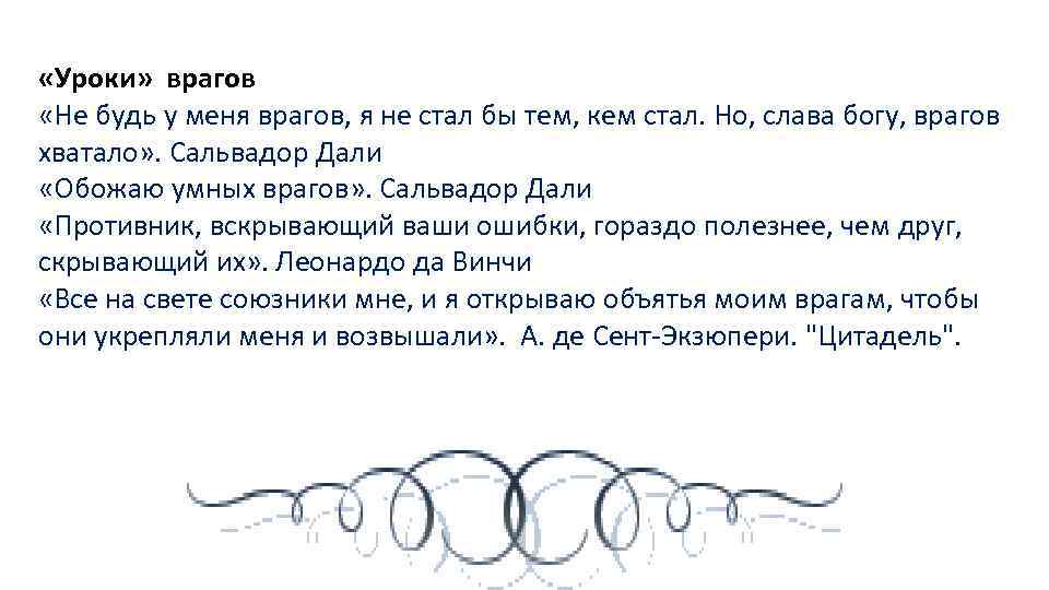 «Уроки» врагов «Не будь у меня врагов, я не стал бы тем, кем стал. Но, слава богу, врагов хватало» . Сальвадор Дали «Обожаю умных врагов» . Сальвадор Дали «Противник, вскрывающий ваши ошибки, гораздо полезнее, чем друг, скрывающий их» . Леонардо да Винчи «Все на свете союзники мне, и я открываю объятья моим врагам, чтобы они укрепляли меня и возвышали» . А. де Сент-Экзюпери. "Цитадель".
