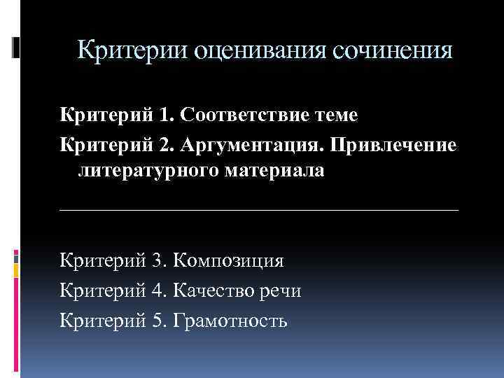 Критерии оценивания сочинения Критерий 1. Соответствие теме Критерий 2. Аргументация. Привлечение литературного материала ___________________ Критерий 3. Композиция Критерий 4. Качество речи Критерий 5. Грамотность