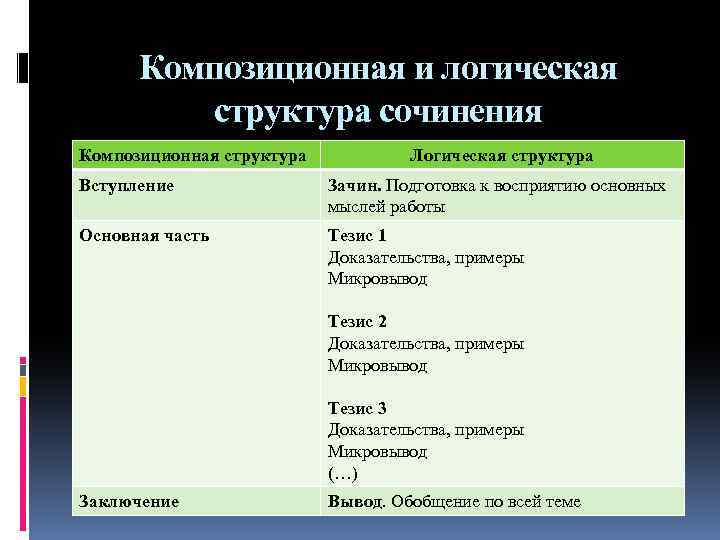 Композиционная и логическая структура сочинения Композиционная структура Логическая структура Вступление Зачин. Подготовка к восприятию основных мыслей работы Основная часть Тезис 1 Доказательства, примеры Микровывод Тезис 2 Доказательства, примеры Микровывод Тезис 3 Доказательства, примеры Микровывод (…) Заключение Вывод. Обобщение по всей теме