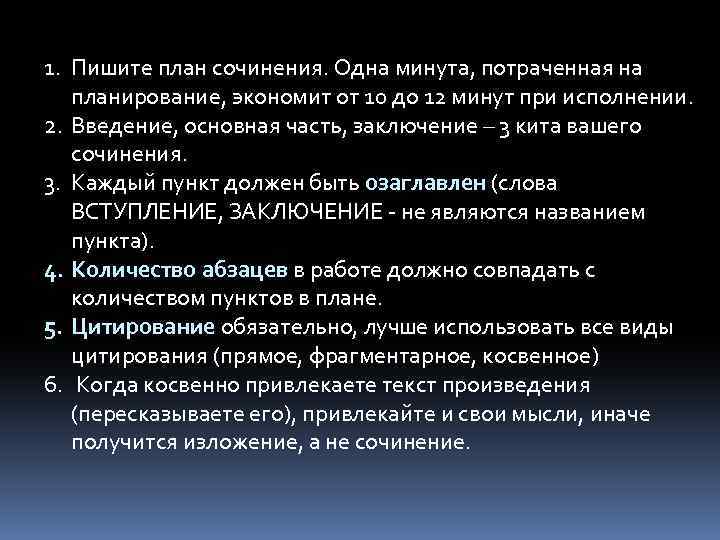 1. Пишите план сочинения. Одна минута, потраченная на планирование, экономит от 10 до 12 минут при исполнении. 2. Введение, основная часть, заключение – 3 кита вашего сочинения. 3. Каждый пункт должен быть озаглавлен (слова ВСТУПЛЕНИЕ, ЗАКЛЮЧЕНИЕ - не являются названием пункта). 4. Количество абзацев в работе должно совпадать с количеством пунктов в плане. 5. Цитирование обязательно, лучше использовать все виды цитирования (прямое, фрагментарное, косвенное) 6. Когда косвенно привлекаете текст произведения (пересказываете его), привлекайте и свои мысли, иначе получится изложение, а не сочинение.
