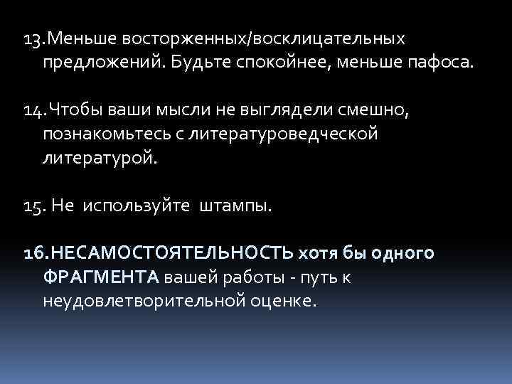 13. Меньше восторженных/восклицательных предложений. Будьте спокойнее, меньше пафоса. 14. Чтобы ваши мысли не выглядели смешно, познакомьтесь с литературоведческой литературой. 15. Не используйте штампы. 16. НЕСАМОСТОЯТЕЛЬНОСТЬ хотя бы одного ФРАГМЕНТА вашей работы - путь к неудовлетворительной оценке.