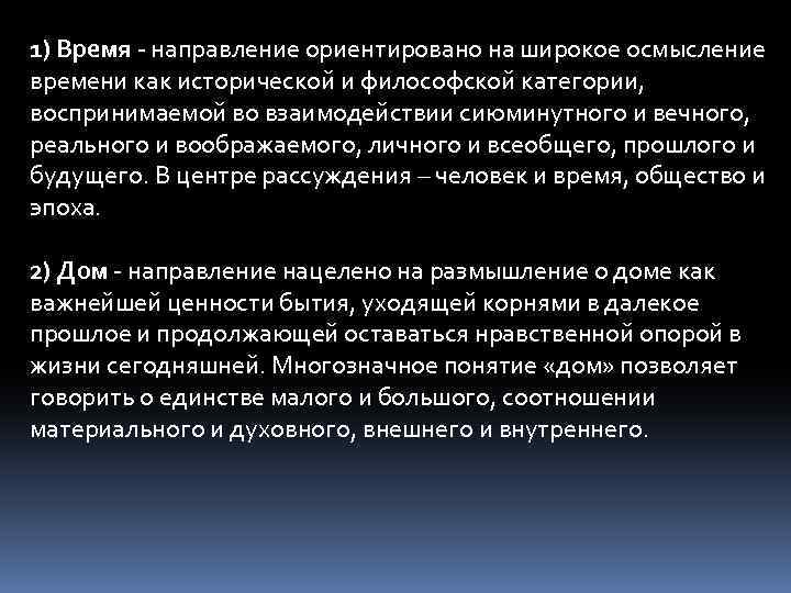 1) Время - направление ориентировано на широкое осмысление времени как исторической и философской категории, воспринимаемой во взаимодействии сиюминутного и вечного, реального и воображаемого, личного и всеобщего, прошлого и будущего. В центре рассуждения – человек и время, общество и эпоха. 2) Дом - направление нацелено на размышление о доме как важнейшей ценности бытия, уходящей корнями в далекое прошлое и продолжающей оставаться нравственной опорой в жизни сегодняшней. Многозначное понятие «дом» позволяет говорить о единстве малого и большого, соотношении материального и духовного, внешнего и внутреннего.