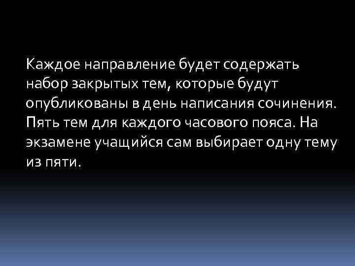 Каждое направление будет содержать набор закрытых тем, которые будут опубликованы в день написания сочинения. Пять тем для каждого часового пояса. На экзамене учащийся сам выбирает одну тему из пяти.