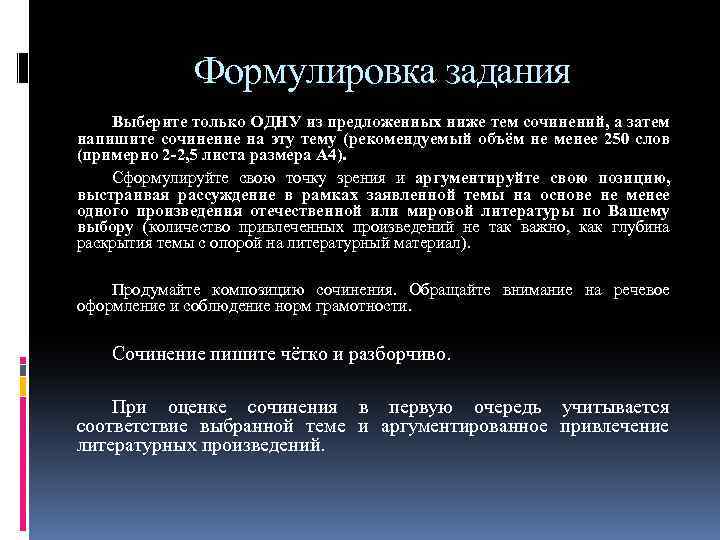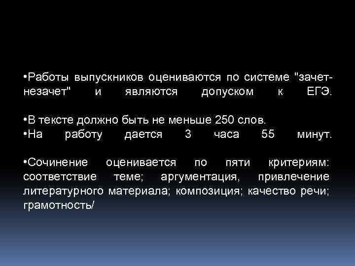 • Работы выпускников оцениваются по системе "зачетнезачет" и являются допуском к ЕГЭ. • В тексте должно быть не меньше 250 слов. • На работу дается 3 часа 55 минут. • Сочинение оценивается по пяти критериям: соответствие теме; аргументация, привлечение литературного материала; композиция; качество речи; грамотность/