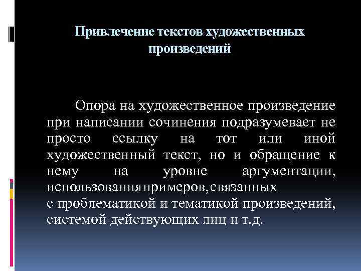 Привлечение текстов художественных произведений Опора на художественное произведение при написании сочинения подразумевает не просто ссылку на тот или иной художественный текст, но и обращение к нему на уровне аргументации, использования примеров, связанных с проблематикой и тематикой произведений, системой действующих лиц и т. д.