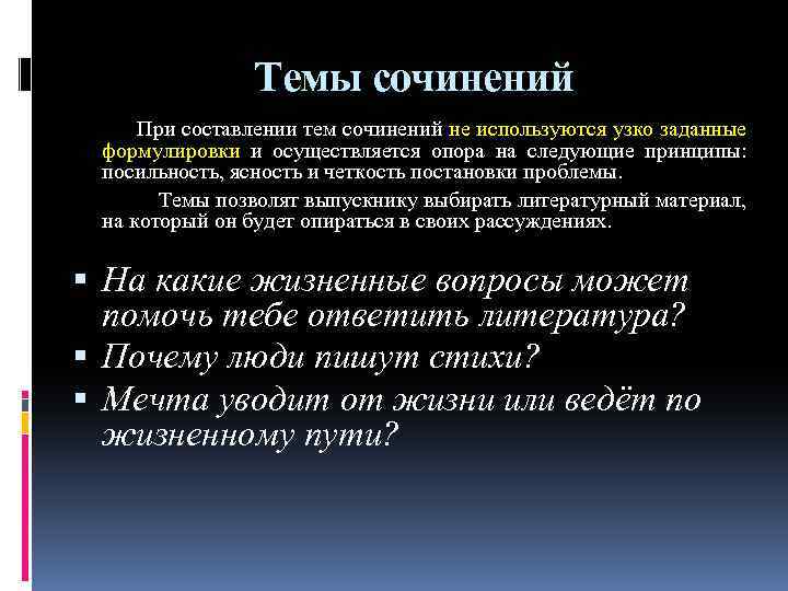 Темы сочинений При составлении тем сочинений не используются узко заданные формулировки и осуществляется опора на следующие принципы: посильность, ясность и четкость постановки проблемы. Темы позволят выпускнику выбирать литературный материал, на который он будет опираться в своих рассуждениях. На какие жизненные вопросы может помочь тебе ответить литература? Почему люди пишут стихи? Мечта уводит от жизни или ведёт по жизненному пути?