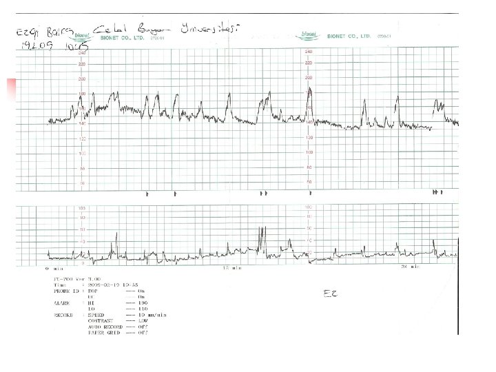 Antepartum fetal monitoring n Contraction stress test (CST) n >30 mm. Hg intra myometrial basınç, >intra arterial basınç Geçici olarak intrauterin blood flow bozulur n Hipoksik fetus geç deselerasyon gösterir. n Geç deselerasyon; stillbirth, IUGR, düşük Apgar