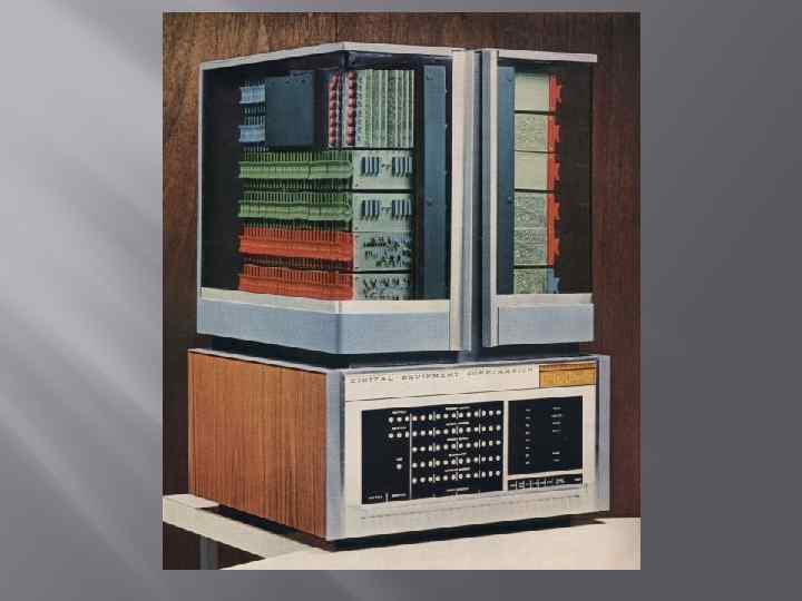 Первый мини-компьютер Первым мини-компьютером считают PDP-8 корпорации DEC. Эта машина создавалась для управления ядерным реактором. Но она стала популярна на частных производственных предприятий и в высших учебных заведениях. Ее массовый выпуск начался 1965 году и к началу 70 -х количество этих ЭВМ превысило 100 000 штук. Важный переход от мини-компьютеров к микрокомпьютерам, это создание микропроцессора. Благодаря БИС стало возможным разместить все основные элементы центрального процессора на одном кристалле. Первым микропроцессором стал Intel-4004 созданный 1971 г. PDP-8