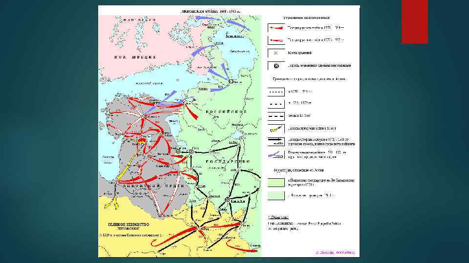Ливонская война (1558 -1583 гг. ) Причина: необходимость для России выхода к Балтийскому морю Р е з у л ь т а т: 1582 г. - Ям-Зампольский мир – Ливония отходила Польше 1583 г. – Плюсский мир – Швеция закрепляла за собой Финский залив, часть Карелии, крепости Нарву, Ивангород, Копорье, Ям, Корелу