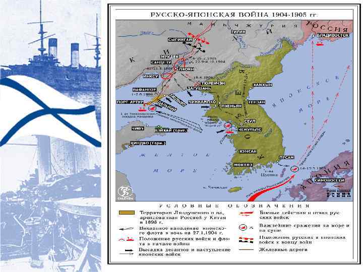 ИТОГИ ВОЙНЫ 9 августа 1905 года в Портсмуте (США) при посредничестве Теодора Рузвельта начались мирные переговоры. Мирный договор был подписан 23 августа (5 сентября) 1905 года. ü Россия уступила Японии южную часть Сахалина (уже оккупированную на тот момент японскими войсками), ü Свои арендные права на Ляодунский полуостров и Южно. Маньчжурскую железную дорогу, соединявшую Порт-Артур с Китайско-Восточной железной